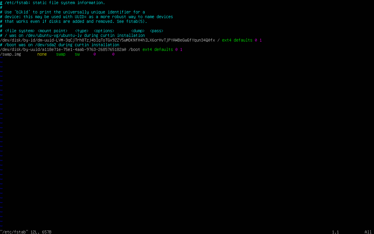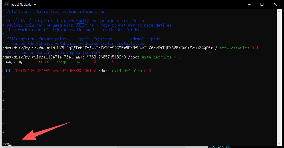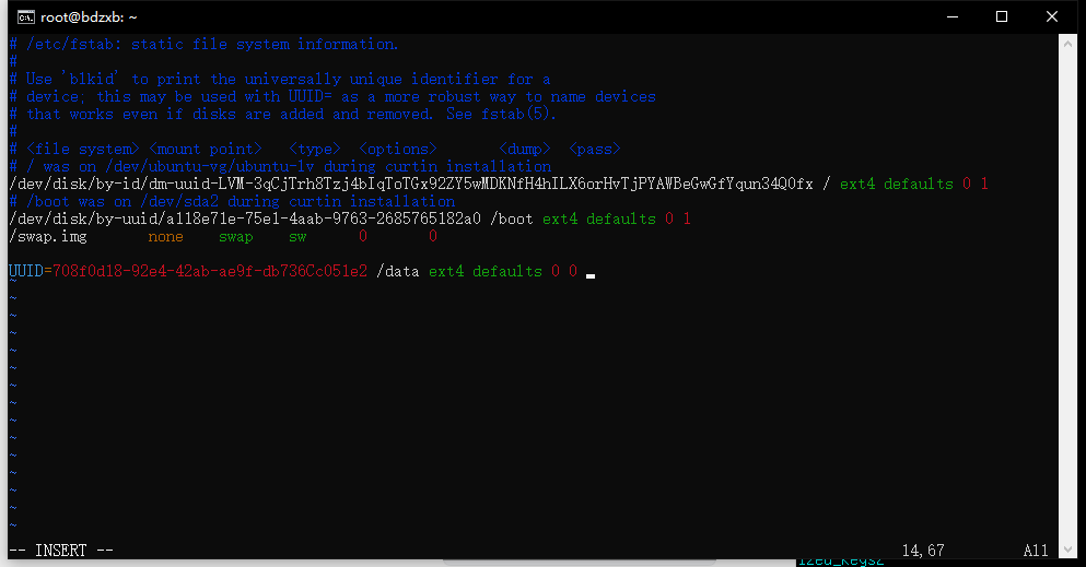 上图的位置按 i 进入编辑模式 在末尾添加 UUID=708f0d18-92e4-42ab-ae9f-db736Cc051e2 /data ext4 defaults 0 0