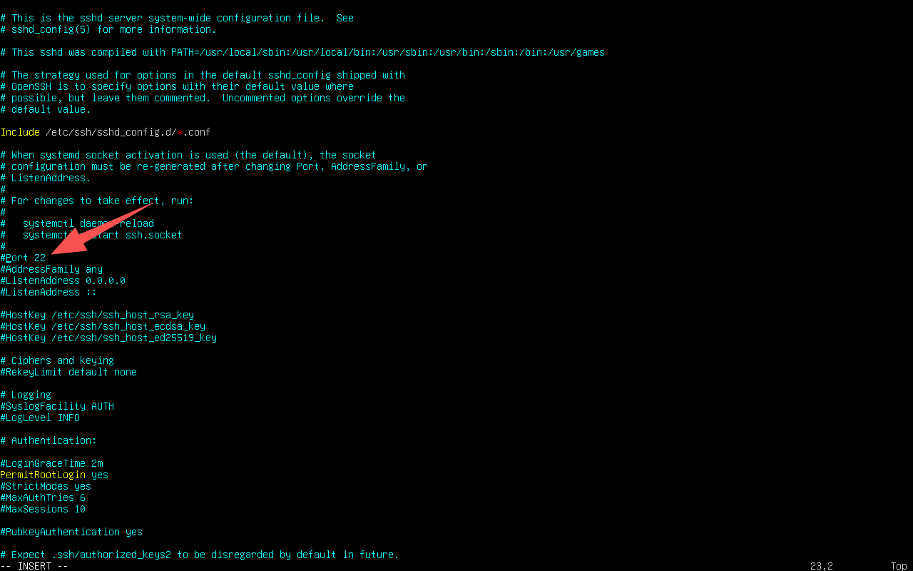 修改 sshd_config配置文件中,#port 22 的位置 去掉# 并将22改为想要改的端口 比如下图改为23